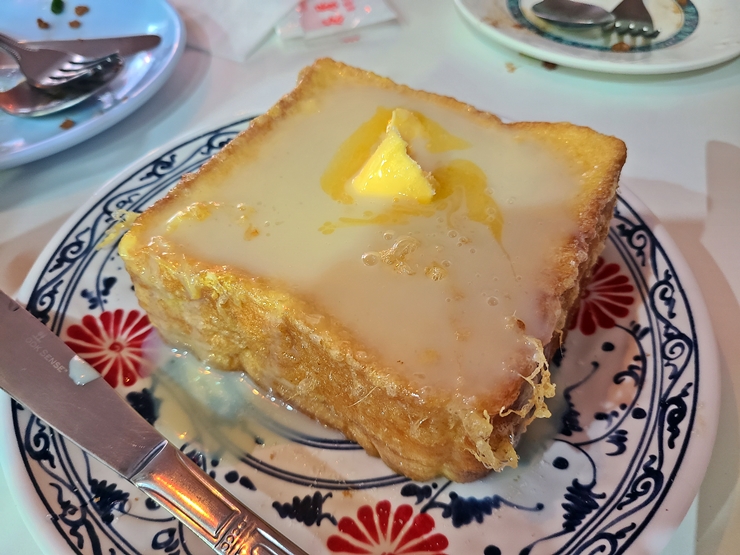 야시장 토스트. 식빵 세 개를 쌓아 만든 토스트다. 연유와 버터가 들어갔기 때문에 도저히 맛이 없을 수가 없다. 이런 재료를 가지고 맛 없게 만든다면 그게 오히려 더 대단한 것이라 할 수 있다. 딱 봐도 칼로리가 높다. 칼로리가 높다는 것은 그만큼 맛있다는 뜻이다. 난 단 음식을 잘 먹지 못하지만 이럴 때는 한 번 먹어도 되기 때문에 꾹 참고 먹었다. 이빨 다 빠지는 줄 알았네.