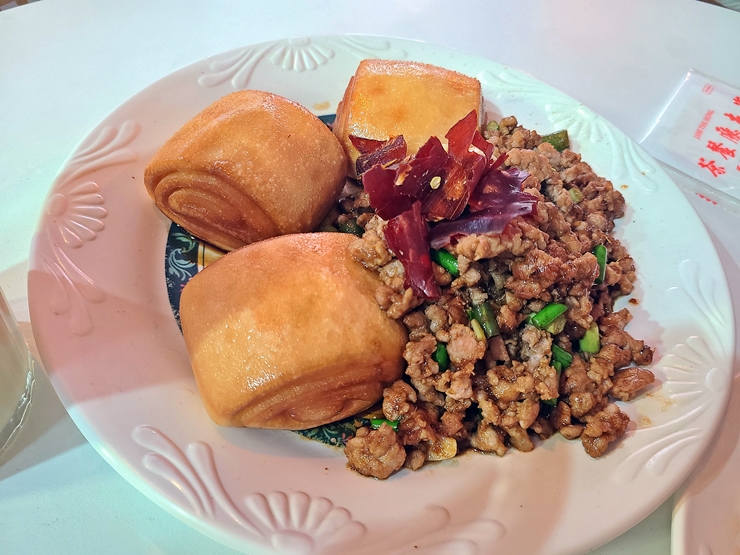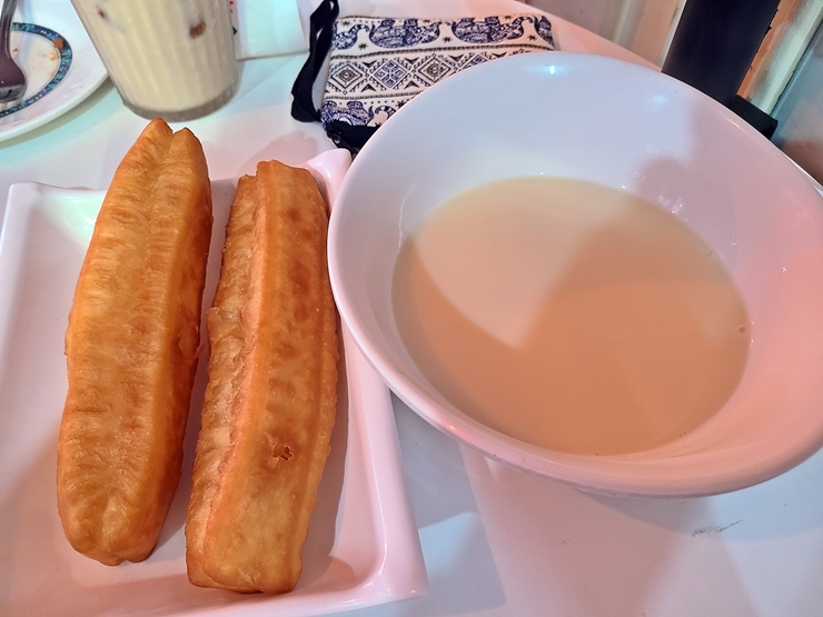 요우띠아오와 또우장. 대구광역시의 특산물이라고 할 수 있는 콩국과 비슷하다. 요우띠아오를 잘게 찢은 후 또우장에 넣어 먹으면 된다. 또우장은 두유인데, 요우띠아오와 잘 어울린다. 아침에 간단히 먹을 수 있는 요리라고 한다. 이른 점심 시간이니 아침이라고 할 수 있지. 아침에 맞는 요리를 먹었다.