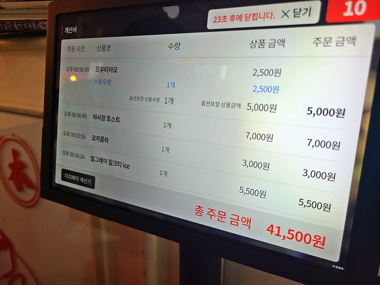 주문은 테이블에 있는 키오스크를 통해 가능하다. 이왕 방문한 거 다양한 요리를 배불리 많이 먹기 위해서 이것저것 주문하기로 했다. 요우디아오에 또우장을 추가하고, 야시장 토스트, 토마토 홍콩 라이스, 대롱볶음, 얼그레이 밀크티와 콜라를 주문했다. 요새는 이렇게 테이블에 앉아서 키오스크를 통해 주문할 수 있는 곳이 많아 참 편리하고 좋다.