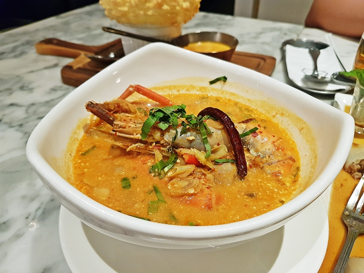 메뉴. 정통 태국 요리 외에 양식과 접목한 퓨전 요리도 판매한다. 메뉴를 천천히 읽어 봤는데 똠양꿍 피자라는 것이 인상 깊었다. 이런 메뉴는 한 번 시켜보고 싶었지만, 같이 간 일행이 뭔가 괴식 같다며 극히 말렸다. 그래서 아쉽지만 똠양꿍 피자는 제외하고, 창펀처럼 생긴 돼지고기 누들, 랍스터 크랩 수플레와 버거 등을 주문했다.