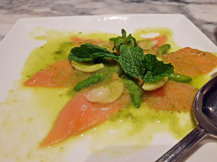 전채 형식으로 먹은 연어 샐러드. 연어 카르파초와 흡사한 모습이다. 소스가 살짝 매콤한 맛이 났는데 고추를 갈아서 드레싱을 만든 것 같다. 연어야 언제 어디서 누구와 어떻게 먹어도 맛있는 재료이기 때문에 전채 형식으로 잘 먹었다. 매콤한 맛이 식욕을 살아나게 하는 효과도 있다.