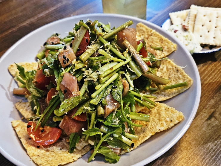 마구로 타르타르. 참치 회 샐러드라고 보면 된다. 나초를 밑에 깔고 참치 회와 미나리와 실파를 가득 올려 만들었다. 특이하게 드레싱을 된장 베이스로 만들었는데 된장의 달고 짭짤한 맛이 참치와 잘 어울렸다. 나초 위에 올려 먹어도 되고 그냥 먹어도 좋다.