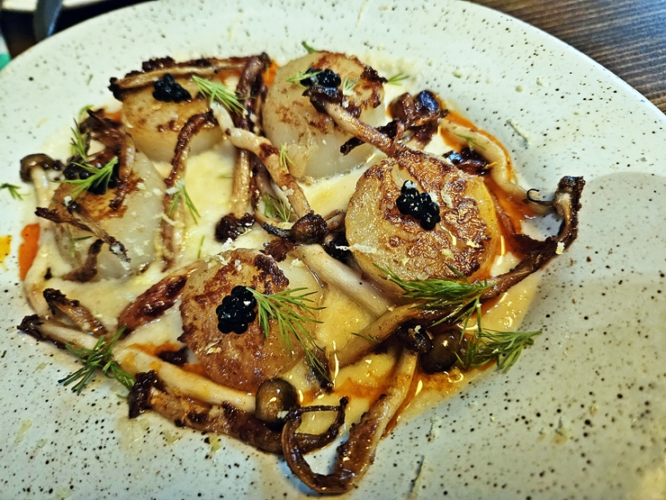 미소크림 관자구이. 관자와 버섯을 구운 후 크림에 일본 된장인 미소를 넣은 소스를 뿌려 나온다. 미소의 맛은 약하게 느껴지는데 이 미소가 크림의 느끼한 맛을 잘 잡아준다. 관자는 신선하다면 어떻게 먹어도 맛이 없을 수가 없는 식재료다. 관자를 너무 타지 않게 구웠다. 마이야르 반응이 일어나서 겉은 살짝 바삭하면서 속은 촉촉했다. 관자는 오래 구울 경우 질겨지는데 굽기가 적절해서 질기지 않았다.