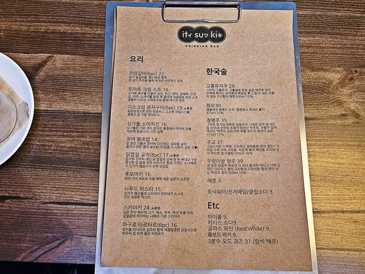 메뉴. 쯔란갈비, 토마토 크림 스프, 미소크림 관자구이, 싱가폴 소이치킨, 청어 봉초밥, 닭껍질 교자, 후토마키, 시푸드 파스타, 스키야키와 마구로 타르트 등을 판매하고 있고, 주류로는 한국 술인 고흥유자주, 화요, 청명주, 주교, 우렁이쌀 청주와 하이볼, 카시스 소다, 글라스 와인, 롱보드 라거와 3분수 오드 괴즈 등을 판매하고 있다. 다음 페이지에는 다양한 와인이 적혀 있었는데 따로 사진을 찍지 않았다. 메뉴는 계절에 따라 바뀐다고 한다.