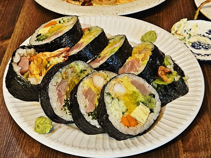 마무리로 주문한 후토마끼. 참치 회, 새우 튀김, 계란말이, 오이와 단무지 등이 들어간다. 사진으로는 크기가 짐작이 잘 안 되지만 상당히 크다. 혼자 한 줄을 다 먹긴 굉장히 어렵고 여러 명이 먹어야 한다. 후토마키가 제법 큰데도 무너지지 않고 잘 만들었다. 이날도 과식을 하고 배를 둥둥 두드리며 잘 들어갔다. 정자동에서 분위기 좋은 다이닝 바를 찾는다면 한 번 가볼 것을 추천하는 곳이다.
