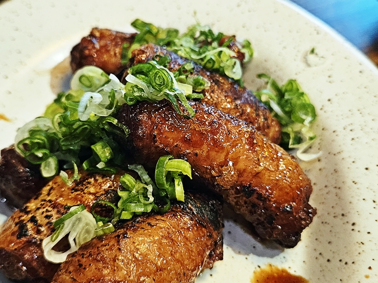닭껍질 교자. 몇 년 전부터 급격히 유행을 하고 있는 교자다. 닭껍질은 닭의 지방 대부분을 가지고 있는 부위인데, 튀겨 먹으면 그 진정한 맛을 느낄 수 있다. 그래서 닭껍질로 만든 튀김도 나오고, 요리도 많이 나오고 있다. 이런 닭껍질을 교자 피로 사용하고 고명을 충실하게 넣어 만들었다. 교자에 파를 올리고 데리야끼 소스를 뿌렸는데 겉은 바삭하고 속은 촉촉해서 좋았다.
