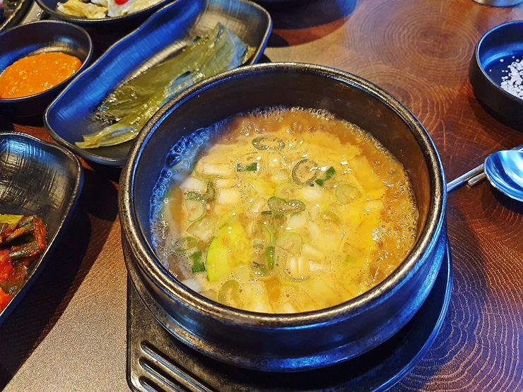 함께 나온 된장찌개. 파, 양파와 두부만 넣어 만든 간단한 된장찌개이지만 맛은 제법 좋았다. 요새는 이런 간단한 된장찌개도 제공하는 곳이 사라지고 있어서 마음이 어두워지고 슬프기 마련이다. 된장찌개를 많이 먹게 되면 고기를 많이 먹지 못하기 때문에 그리 많이 먹진 않았다. 친구들 역시 나와 같은 마음인지 다들 고기를 열심히 탐했지.
