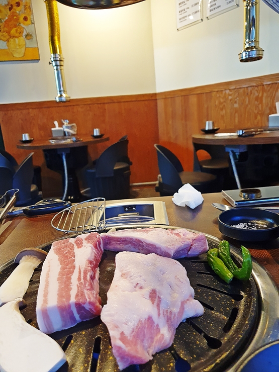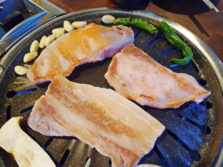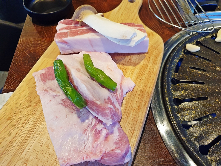 아름다운 모습의 삼겹살과 항정살. 역시 고기 사진은 언제 보아도 아름답다. 꽈리고추와 새송이 버섯도 나오긴 하지만 고기 앞에서는 한 없이 초라한 모습이다. 화목은 고기를 직원이 직접 구워주기 때문에 고기가 구워지는 것을 바라 보며 편안하게 담소를 나눌 수 있는 장점이 있다.
