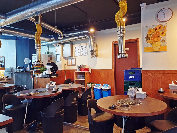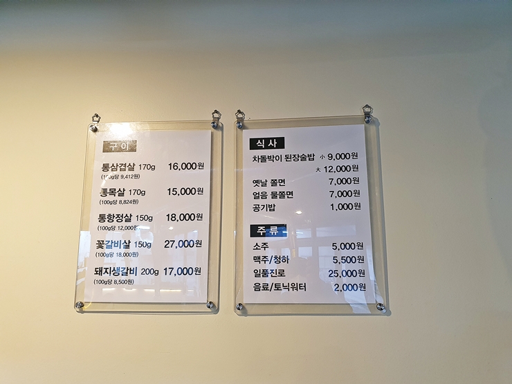 메뉴. 돼지고기는 삼겹살, 목살, 항정살과 생갈비를 판매하고 있고 소고기는 꽃갈비살을 판매하고 있다. 그 밖에 식사 메뉴로 차돌박이 된장술밥, 쫄면을 판매한다. 소주는 5,000원인데 맥주가 5,500원이었다. 오, 세상에 맙소사. 이렇게 슬픈 일이 또 있을 줄이야. 술 값이 점점 오르는 것을 보니 진짜 물가가 급격히 뛰는 것을 느낀다. 일단 다소곳하게 삼겹살 1인분과 항정살 2인분을 주문했다.