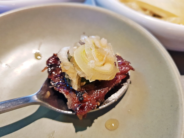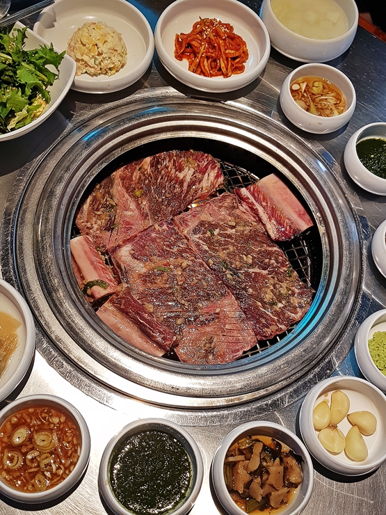 아름다운 수원양념갈비. 고기가 나오자마자 빠르게 불판에 올리려고 하는 것을 잠시 멈추고 사진을 찍었지. 예전에는 양념이 된 고기를 잘 먹지 않았는데 입맛이 변했는지 이젠 이런 양념 베이스의 고기도 참 좋아한다. 양념은 수원왕양념갈비나 LA갈비와 동일한 것을 사용하는 것 같다.