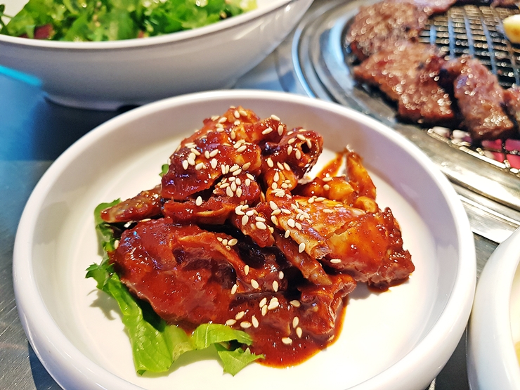 사진을 예쁘게 찍기 위해서 데코레이션을 좀 했다. 양념이 과하게 달지 않고 적절하다. 예전에 양념이 된 고기를 싫어했던 이유가 양념이 너무 자극적이었는데, 이렇게 자극적이지 않으니 요새 즐겨 먹는 것 같다. 딱 소주 한 잔 하고 싶었는데 점심에 술을 마시지 않겠다고 다짐을 해서 술은 꾹 참았다.