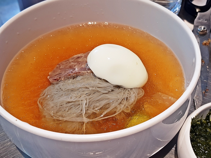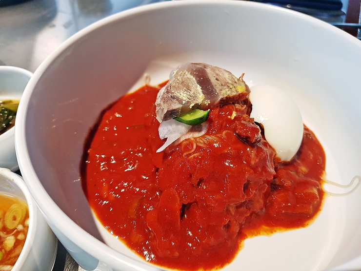 후식으로 무생채볶음밥을 먹을까 하다가 이번에는 냉면을 주문했다. 냉면은 물냉면과 비빔냉면이 있는데 둘 다 주문했다. 물냉면은 그냥 고깃집 냉면의 맛이다. 일반적인 고깃집 냉면에 비해 수준이 좀 높긴 하지만 평양냉면을 좋아하는 사람에게는 좀 자극적으로 느껴질 수 있다.