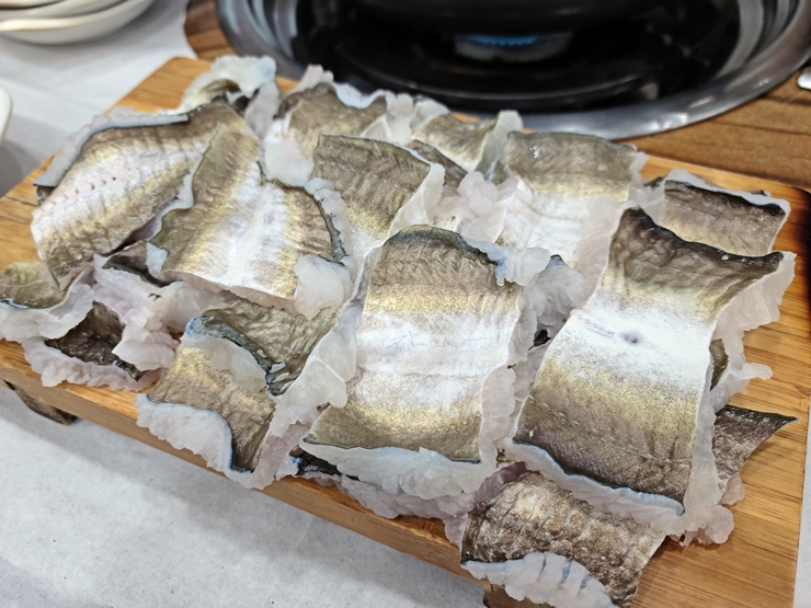 샤브샤브용 갯장어. 갯장어를 넓게 펼쳐 잘랐다. 너무 푹 익힐 경우 살이 으스러진다면서 적당히 익히라는 친절한 설명을 들었다. 그렇다면 설명을 잘 따르도록 해야지.