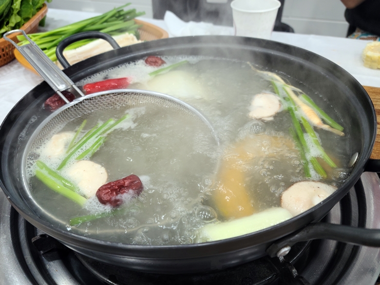 샤브샤브용 갯장어와 함께 육수가 나온다. 갯장어 뼈를 우려낸 육수에 한약재와 채소를 넣어 만든 육수라고 한다. 육수는 우리면 우릴수록 진해진다고 해서 중불 정도로 조절해서 계속해서 끓였다.