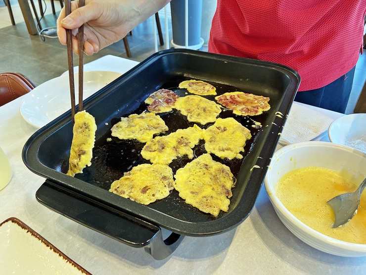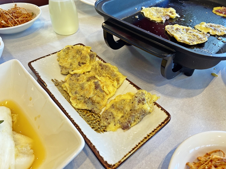 전담 직원이 잘 풀은 계란물을 이용해서 육전을 부친다. 지글지글 육전이 익는 소리와 고소한 냄새가 나면 날수록 식욕을 자극한다. 이런 육전에는 소주나 맥주를 한 잔 해야 하는데 다음 날 일정도 있고 해서 술은 마시지 않았다. 지금 생각하니 참 아쉽고 서운하구나. 다음에 갈 때는 꼭 술 한 잔 해야지.