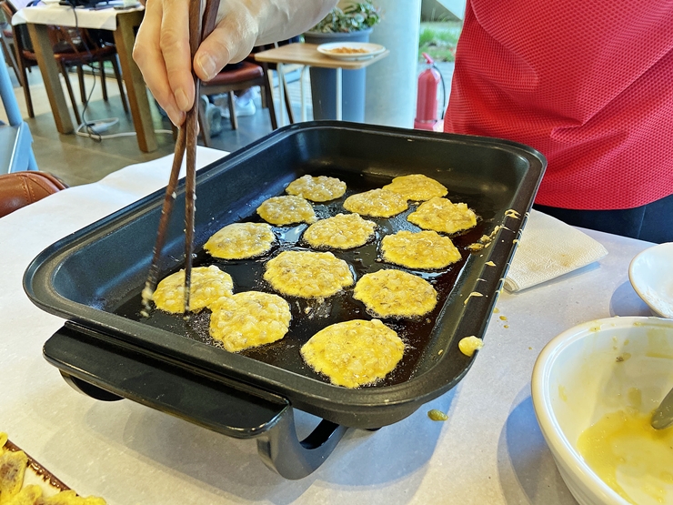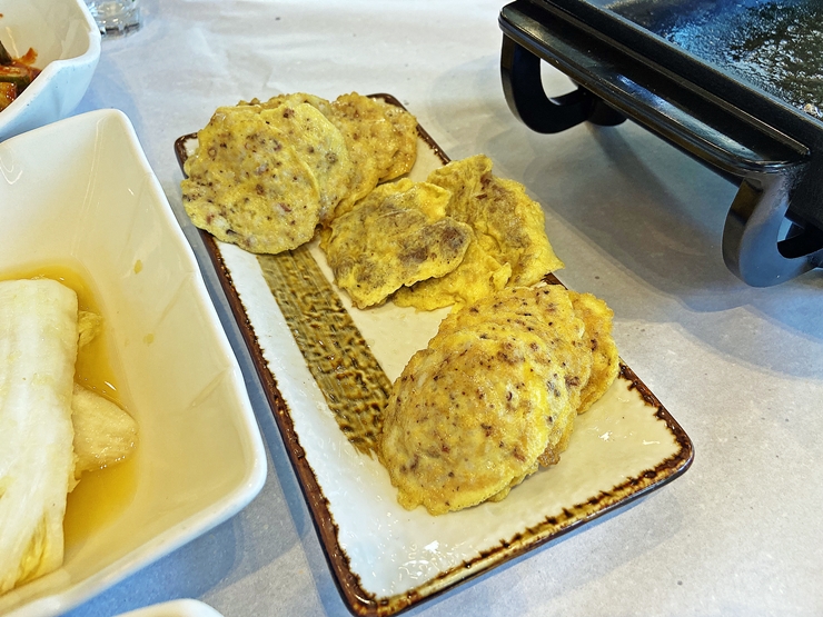 육전을 보람차게 먹은 후 낙지전을 먹기로 했다. 낙지전은 낙지를 잘게 다진 것을 이용해서 만든다고 한다. 마치 낙지 탕탕이와 같은 비주얼이다. 이 상태로 먹어도 참 맛있겠지만 이왕 먹는 거 더욱 맛있게 먹어야지. 기름에 지진 음식은 맛이 없을 수가 없다.