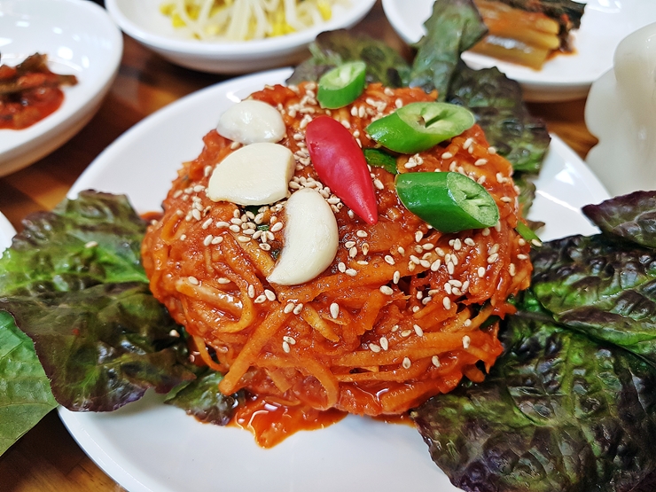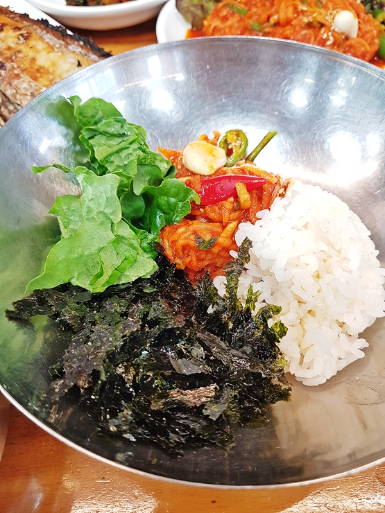 양푼에 서대 회 무침, 상추와 김가루를 넣어서 맛있게 비벼 먹으면 된다. 마치 고급스러운 양념 회 덮밥 같은 비주얼이다. 회 덮밥은 잘 먹지 않는 편인데, 이렇게 먹는 것이 맛있다고 해서 그에 따르기로 했다. 새콤달콤한 냄새가 식욕을 더욱 자극한다.