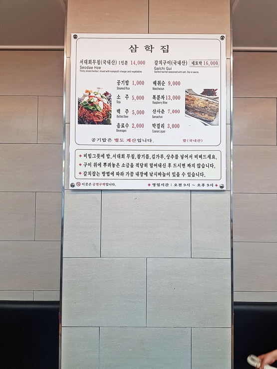 메뉴. 서대 회무침과 갈치 구이를 판매하고 있다. 갈치 구이는 최근에 가격을 올린 거 같다. 개인적으로 고등어, 꽁치 같은 등 푸른 생선을 좋아하기 때문에 갈치 구이는 그리 즐겨 먹는 편이 아니지만 이럴 때는 흔쾌히 먹는 것이 인지상정이지. 갈치를 낚시 바늘로 잡기 때문에 내장에 바늘이 나올 수도 있다는 안내문이 적혀 있긴 하지만 개인적으론 참 성의 없고 책임감이 없다는 느낌을 받았다. 갈치 내장은 쓴 맛이 강해서 잘 먹지 못하는 편이기 때문에 내장을 제거한 후 제공을 하면 더욱 좋을 거 같다.