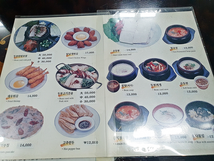 메뉴. 상호에서 알 수 있는 것처럼 콩을 사용해서 만드는 요리가 많다. 대표적인 메뉴는 두부한방보쌈, 청국장과 콩국수라고 한다. 콩 요리를 싫어하는 어린아이들을 위한 닭날개 튀김, 새우튀김과 고추만두도 준비 되어 있다. 나와 짝꿍은 콩국수와 감자전을 주문하고, 비 오는 날에 어울리는 동동주도 주문을 했다.