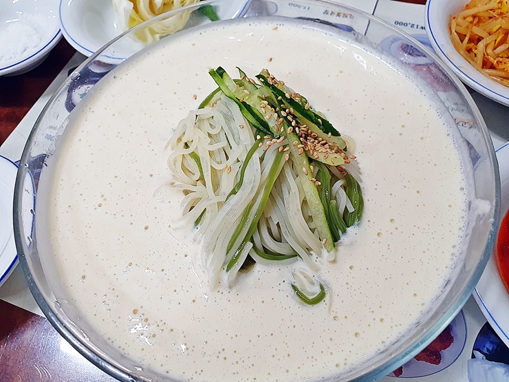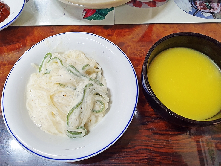 콩국수. 특이하게 두 종류의 면을 넣었다. 색을 통해 유추하면 일반 면과 한때 유행했던 클로렐라 면인 것 같다. 양이 상당히 많아서 다른 음식 없이 콩국수만 먹어도 충분히 배가 부를 것 같다. 짝꿍과 함께 먹는 것이기 때문에 앞 접시에 덜어서 먹기로 했다.