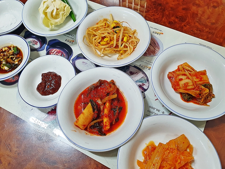 반찬. 양배추, 고추, 콩나물 무침, 김치, 된장, 열무김치와 볶음김치가 나온다. 다양한 김치가 전부 맛이 좋아서 리필을 했다. 요새는 음식을 맛있게 하는 곳이 많아져서 김치 같은 반찬으로 개성을 보이는 곳이 많다. 그래서 김치가 맛있는 곳에 가면 기분이 좋고, 김치가 맛없는 곳에 가면 기분이 나쁘기 마련이다.