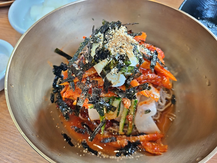 기본 반찬은 평범한 편이다. 들기름 막국수를 파는 곳에 가면 기본 반찬이 무절임 하나 나오는 곳이 많은데 백김치까지 주는 것은 참으로 좋은 일이 아닐 수 없다. 인원이 많았기 때문에 양해를 구하고 하나씩 더 받아서 먹었지.