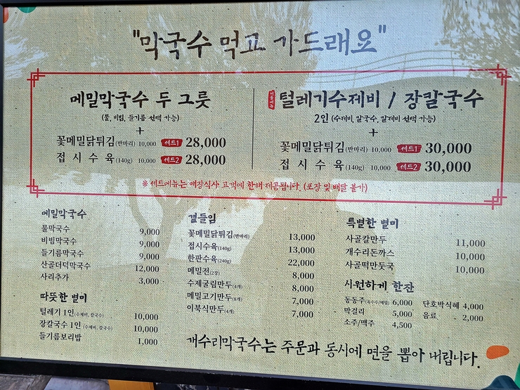 꽃 메밀 닭 튀김과 개수리 돈까스. 이야, 이거 물건이다. 돈까스는 기성품을 사용하는 것 같았는데 맛을 보니 막상 기성품의 맛이 아니었다. 느끼하지 않고 고소하면서도 담백한 맛이 잘 느껴진다. 소스가 너무 과하게 뿌린 상태로 나와서 소스를 걷어내고 먹었는데 그것이 바로 신의 한수였다. 꽃 메밀 닭 튀김은 메밀 향은 전혀 느껴지지 않았지만 깔끔한 후라이드 치킨이었다. 돈까스나 치킨에서 이런 깔끔하게 기름진 맛을 느낀 것은 오랜만이었다. 아마 기름을 오래 사용하지 않고 자주 교체하는 것 같았다. 의정부에서 맛있는 들기름 막국수, 수육, 돈까스와 치킨을 먹고 싶다면 추천하는 곳이다.