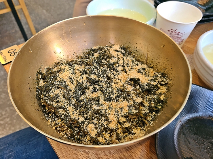 들기름 막국수. 들기름 막국수를 파는 곳이라면 쉽게 볼 수 있는 비주얼이다. 막국수에 들기름을 뿌린 후 그 위에 김과 깨를 잔뜩 올려 마무리했다. 참으로 간단하기 그지 없는 국수다. 이 간단한 국수가 갑자기 왜 유행을 했는지 잘 모르겠다. 야무지게 잘 비빈 후 맛을 봤다. 맛이 진하지 않고 슴슴하고 깔끔하다. 그래서 느끼한 맛이 덜 하다. 라이트한 맛을 좋아하는 사람이라면 굉장히 좋아할 맛이었다.