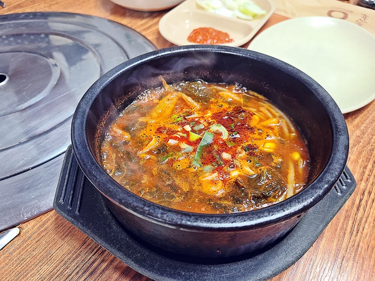 뼈찜을 주문하면 해장국을 준다. 해장국은 뼈해장국에서 뼈만 빠진 모습이다. 우거지, 콩나물 등이 들어 있는 해장국이 상당히 시원하고 맛이 깊다. 이 해장국 하나로도 소주 한 병은 거뜬히 마실 수 있을 정도이다. 해장국을 안주 삼아 소주를 기울이니 뼈찜의 맛이 절로 기대가 되었다.