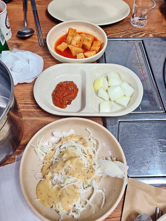 기본 반찬. 깍두기, 양파와 사라다가 나온다. 이런 사라다는 사라다라고 불러야지, 샐러드라고 부르면 뭔가 어색하다. 반찬 맛은 평범한 편이었다. 평범한 수준이면 충분하다. 기본 반찬이 무척 맛있다면 뼈찜을 많이 먹지 못하는 불상사가 생기기 마련이다. 뼈찜을 먹을 때 깍두기, 양파와 사라다 등의 채소로 배를 채우는 것처럼 어리석은 일이 없다. 이런 것을 고려하여 반찬을 평범하게 만든 것 같다.