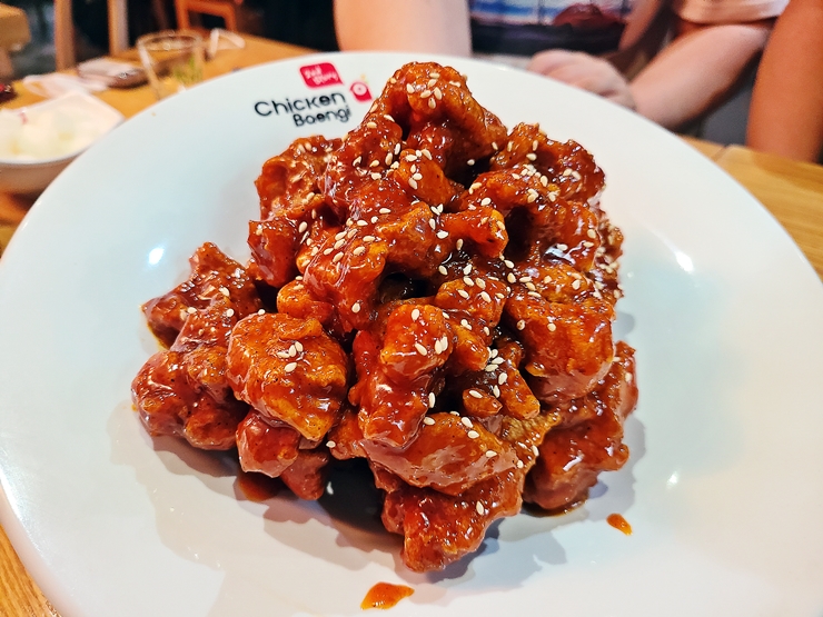 양념 순살 치킨. 양념이 안 묻은 곳 없이 잘 버무려진 모습이다. 동기 녀석이 사진을 잘 찍으라고 친히 접시를 기울여줬다. 녀석, 평소에는 이런 친절한 배려를 하지 않았는데. 이러한 행동을 보면 녀석은 정말 취한 것이 틀림 없었다. 하여간 덕분에 편하고 예쁘게 사진을 찍었다. 양념 소스는 과하게 자극적이지 않고 달달한 맛이 강하게 나면서 살짝 매콤한 맛이 같이 느껴진다.