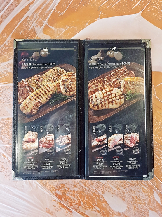 메뉴. 삼겹살, 목살과 갈비가 나오는 모둠 한 판과 갈매기살, 항정살과 가브리살이 나오는 특별 한 판이 하남돼지집의 시그니처 메뉴라고 할 수 있다. 양이 적은 사람들을 위한 단품 메뉴도 판매하고 있으니 선택의 폭이 넓다는 것이 장점이다. 일단 우린 모둠 한 판을 주문하고 경건한 자세로 고기를 기다렸다.