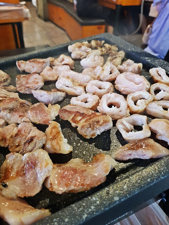 예전에는 없었던 막창을 판매하고 있어서 목살과 막창을 추가 주문했다. 짝꿍은 소곱창은 비교적 잘 먹는 편인데, 돼지 곱창이나 돼지 막창은 잘 먹지 못한다. 그래서 짝꿍과 돼지 내장을 잘 먹지 못하는데, 이번에 돼지 막창을 보니 참으로 반갑기 그지 없었다. 마치 학창 시절의 동창을 만나는 기분이랄까.