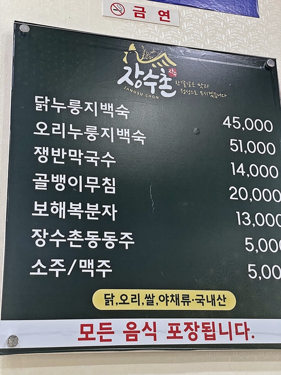 메뉴. 누룽지 백숙은 닭과 오리를 판매하고 있고 그 밖에 쟁반 막국수와 골뱅이 무침도 판매하고 있다. 그와 잘 어울리는 복분자, 동동주, 소주와 맥주도 판매하고 있다. 대구에서 4,000원 짜리 소주를 마시다가 여기서 5,000원 짜리 소주를 마시려니 뭔가 억울한 느낌이 들어서 장수촌 동동주를 한 병 주문했다.