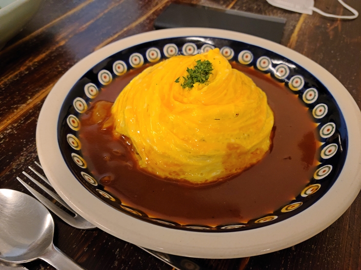 내가 주문한 라라 오므라이스 오리지널. 오리지널과 매콤한 맛이 있다고 하는데 요새 매운 음식을 좀 즐겨 찾았더니 속이 안 좋아졌기도 하고 요새 매운 음식을 일부러 기피 하기도 해서 오리지널로 주문했다. 예전에 잠깐 유행했던 회오리 오므라이스 스타일로 만드는데 생각보다 준수하게 나와서 조금 놀랐다. 계란이 흐물거리거나 과하게 익지 않아서 계란의 촉촉함을 밥과 함께 잘 즐길 수 있었다.