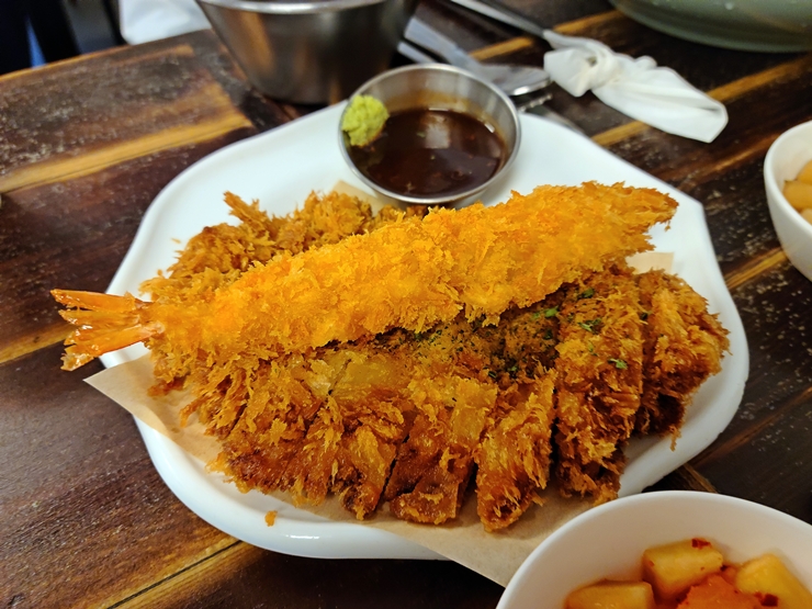 돈까스와 새우가는 이렇게 따로 나온다. 따로 나오는 것이 정답이다. 같이 나올 경우 모든 맛을 해칠 가능성이 크기 때문이다. 들기름 막국수 맛은 그냥 어디서나 편하게 먹을 수 있는 들기름 막국수 맛이라고 하는데 돈까스 맛이 좋다고 한다. 들기름이 향과 맛이 강한 개성 있는 조미료이기 때문에 사실 어딜 가더라도 맛 없게 만드는 곳을 찾기가 어렵다.