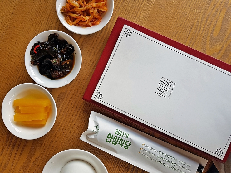 밑반찬. 특이하게 목이버섯 조림이 함께 나온다. 목이버섯 조림을 반찬으로 제공하는 곳은 지금껏 한 번도 보지 못해서 상당히 색달랐다. 정원의 전속림 셰프는 서울 임페리얼 팰리스 천산의 총괄 셰프를 역임했었고, 더 플라자, 리츠칼튼에서도 근무를 했던 굵직굵직한 경력이 있는 셰프다.