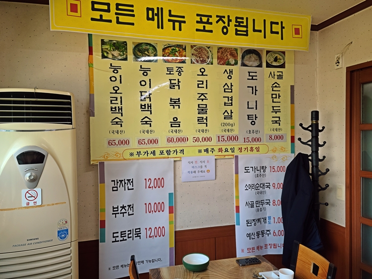 메뉴. 뜨락가든에서는 여러 음식을 팔지만 단연 잘 나가는 것은 능이오리백숙, 능이닭백숙과 도토리묵이라고 한다. 오리가 닭보다 단가가 비싼 음식인데 오리백숙과 닭백숙의 가격이 같았다. 잠시 닭백숙을 먹을까 고민을 했지만 처음 목표로 한 능이오리백숙을 먹기로 결정. 백숙이 나오기까지 시간이 좀 걸리기 때문에 간단히 먹을 음식으로 도토리묵도 주문했다.