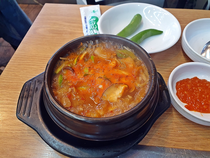 함께 주문한 된장찌개. 2,000원이라는 저렴한 가격이라서 양은 적지만 구성은 풍부하다. 애호박, 양파, 새송이 버섯과 팽이 버섯 등이 들어 있는 채소 된장찌개다. 맛이 굉장히 깊고 풍부해서 고기와 함께 잘 어울린다. 짝꿍도 참 맛있게 잘 먹었다.