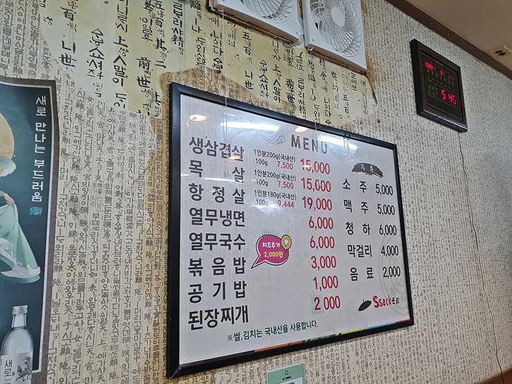 메뉴. 고기는 삼겹살, 목살과 항정살을 판매하고 있고 그 밖에 열무냉면, 열무국수, 볶음밥과 된장찌개를 판매하고 있다. 200g에 15,000원이라는 가격은 참으로 합리적이라 할 수 있다. 요새는 120g에 15,000원인 곳도 생겼는데, 그런 곳을 갈 때면 참 슬프기 그지없다. 우리는 삼겹살 2인분과 된장찌개를 주문했다.