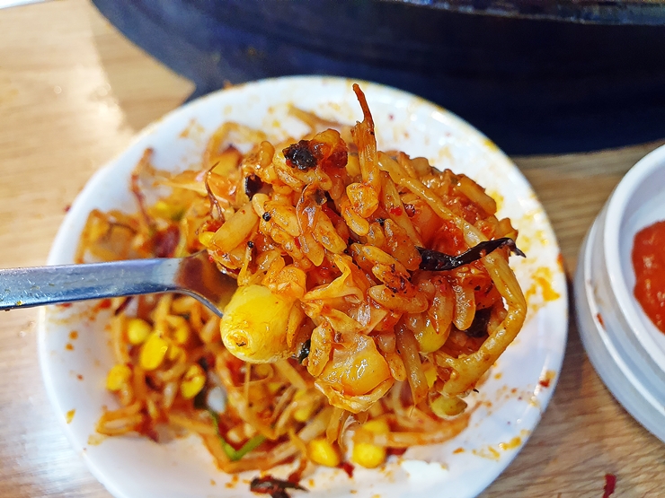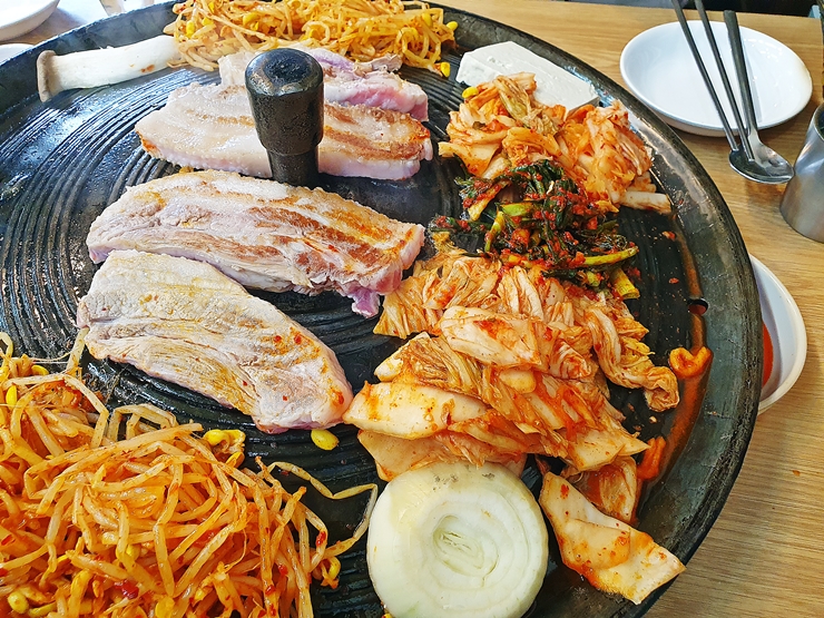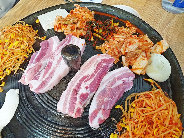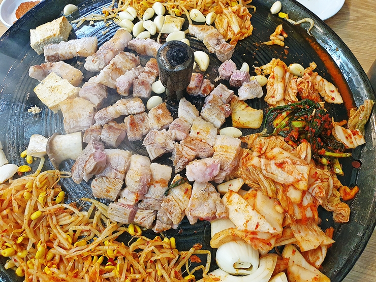 고기가 나올 때 콩나물 무침, 김치, 파김치, 두부, 양파와 새송이 버섯을 솥뚜껑에 올려준다. 고기도 직접 올려 주는데 고기만 따로 사진을 찍지 못한 것이 아쉽다. 2인분이라서 양이 적어 보이긴 하지만 고기를 먹기 좋은 사이즈로 자르면 솥뚜껑이 꽉 찬다.