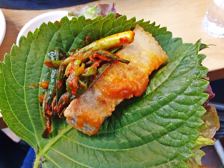 함께 나온 상추, 깻잎에 쌈을 해서 먹어도 참 좋다. 난 상추보다 깻잎을 좋아하는 편인데 이렇게 함께 먹으면 더욱 맛있게 먹을 수 있다. 평소에 채소를 많이 먹지 않는 편이라서 짝꿍이 항상 구박을 하는데 이렇게 짝꿍 앞에서 채소를 많이 먹는 모습을 보여야 한다.