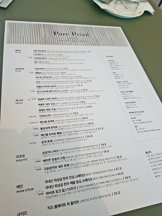 메뉴. 가격은 의정부인 것을 감안하면 비교적 높은 가격을 형성하고 있다. 아마 주변 풍경 값도 포함이 된 것 같다. 여기까지 왔으니 가격은 생각하지 않고 즐기는 것이 낫다. 화덕 피자, 파스타, 리조또와 스테이크 등 다양한 메뉴가 준비 되어 있다.