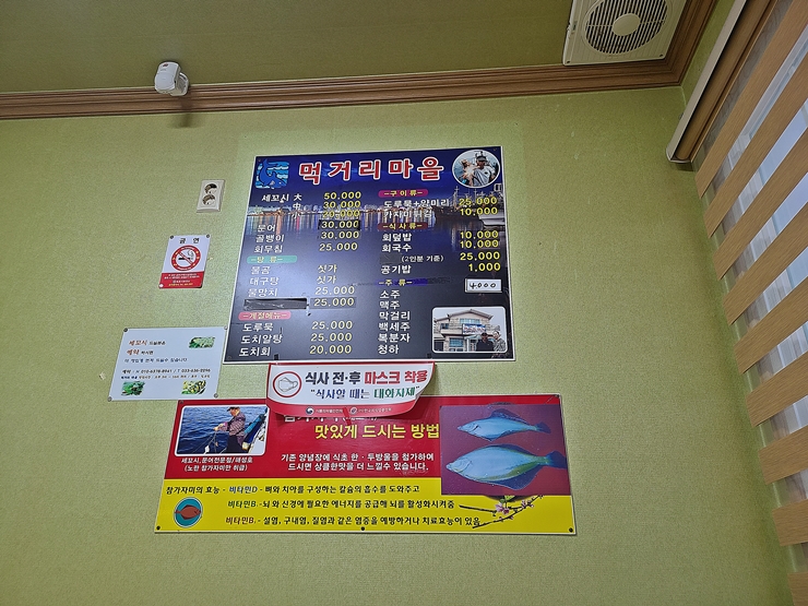 메뉴. 해산물의 고장답게 해산물이 많다. 싯가로 팔리는 메뉴가 몇 개 보이는데 조업 상황에 따라 가격이 달라진다고 한다. 가게 사장이 매일 직접 조업을 나간다고 한다. 연세가 좀 들어 보였는데 대단하다고 느꼈다. 우린 도치알탕을 먹으러 왔기 때문에 다른 것들이 유혹을 굳세게 뿌리치고 얌전히 도치알탕을 주문한 후 기다렸다.