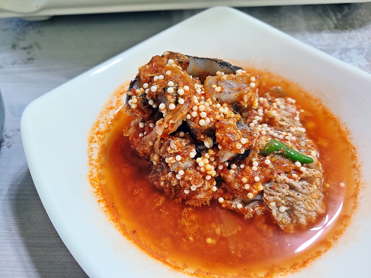 아기다리 고기다리 도치알탕. 고추로 만든 되게 귀한 가루인 고춧가루와 후추가 후추후추 듬뿍 들어가서 얼핏 보면 굉장히 매워 보이는 것 같지만 전혀 맵지 않고 시원한 맛을 강하게 느낄 수 있는 것이 특징이다. 이제 개인 접시에 덜어 맛있게 먹어 봐야지.