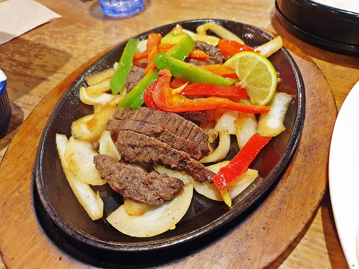 스테이크 화이타. 양이 적다. 두 명이 먹기에 충분하다고 했는데 썩 충분치 않아 보인다. 생긴 것은 딱 전형적인 화이타의 모습이다. 라임이 한 조각 들어 있는데 짝꿍이 라임을 짜서 화이타에 넣을 것 같아서 사진을 찍은 후 빠르게 찍었다. 후후후. 신 맛을 싫어하는 나에게 라임은 좋지 못한 선택이지.