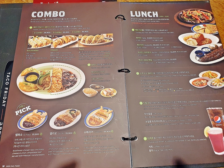 메뉴. 점심 시간이 제법 지났음에도 런치 코스가 주문 가능하다고 해서 런치를 주문하기로 했다. 두 명이 올 때 보통 어떻게 주문을 하는지 물으니 런치 코스 하나면 충분하다고 한다. 과연 충분할까 싶었지만 부족하면 나중에 다시 추가 하기로 하고 스테이크 화이타, 샐러드와 마가리타를 주문했다.