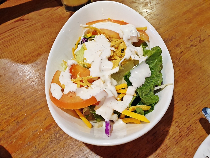 하우스 샐러드. 드레싱은 스모크드 할라피뇨 비네거, 치폴레 머스터드와 렌치 소스 중 하나를 고를 수 있는데 렌치 소스를 골랐다. 샐러드에는 잘게 자른 나초, 토마토, 체다 치즈, 양파, 로메인과 양상추 등이 들어 있었다. 전채로 가볍게 먹을 수 있는 딱 좋은 사이즈와 맛이었다. 역시 짝꿍이랑 채소를 먹으면 짝꿍 없이 먹을 때보다 맛있구나.