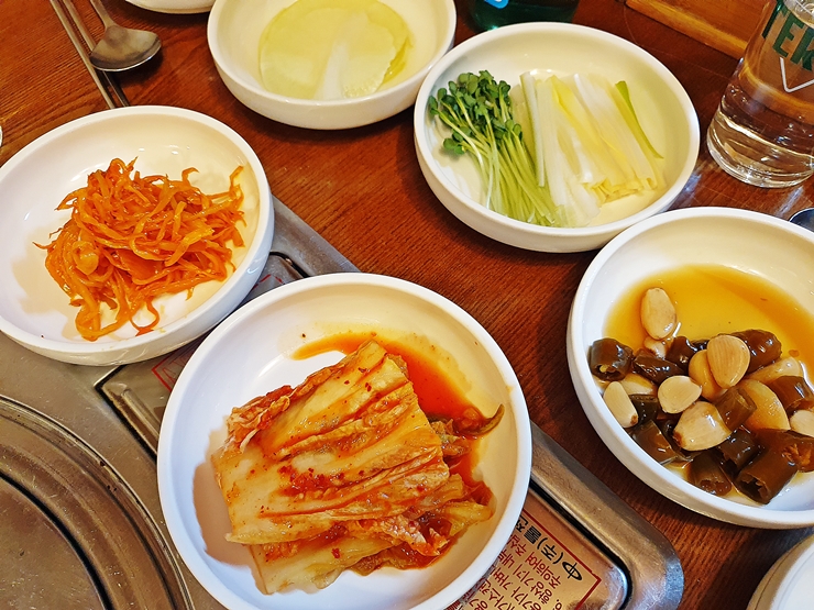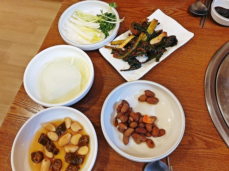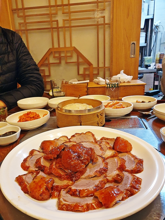 반찬. 오리고기를 먹을 때 딱 필요한 것들만 나온다. 반찬 맛은 평범한 편인데 유독 갓김치는 엄청 맛있다. 괜히 "갓"이 붙은 게 아닐 정도로 뛰어난 맛을 낸다. 그냥 먹어도 맛있고 전병에 오리고기와 함께 넣어 먹어도 맛있다. 이런 훌륭한 안주들로 오기고기가 나오기 전부터 소주 한 병을 클리어했지.