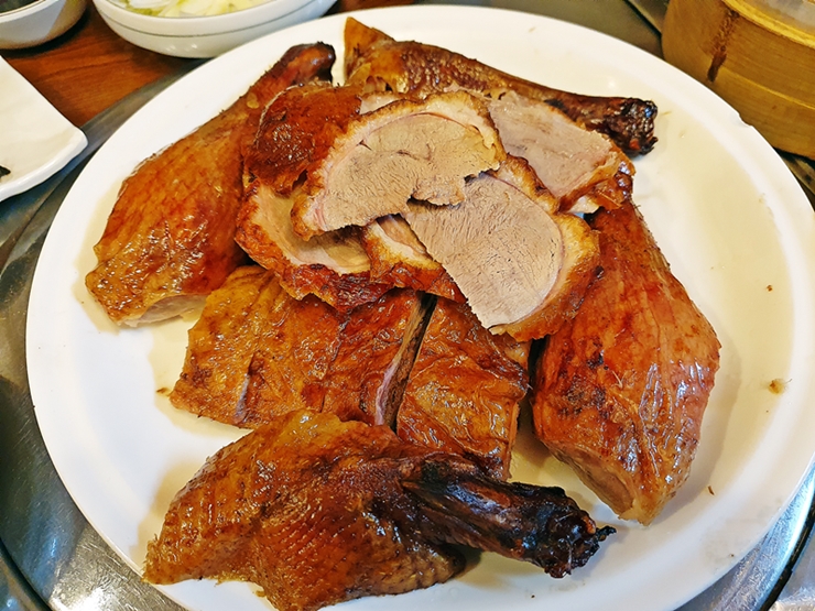한 판을 거의 다 먹고 있으면 타이밍 좋게 나머지도 가져다준다. 오리다리, 날개와 가슴살의 구성이다. 4명이 방문을 했기 때문에 다리와 날개를 사이 좋게 나눠 먹었지. 편으로 썰어 나온 오리고기도 맛있지만 이렇게 통으로 뜯어 먹는 오리고기 역시 맛이 참 좋다.